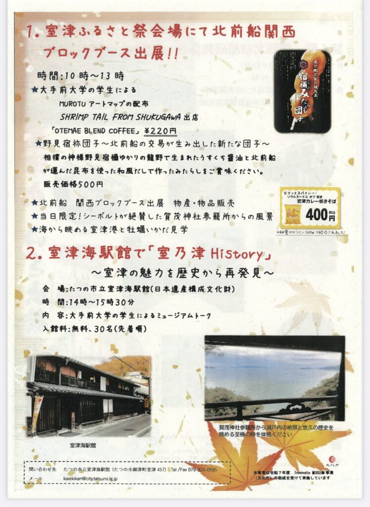 ①大手前大学 現代社会学部観光・地域マネジメント専攻の学生による室津を素材にした 新魅力コンテンツの販売・発信、 ② 関西ブロック 11 自治体の紹介 ロールアップバナーの設置と物産販売 、③ シーボルトが絶賛した室津賀茂神社瀬戸内の風景を眺めながらのお茶席 、④海から眺める室津港と牡蠣いかだ見学