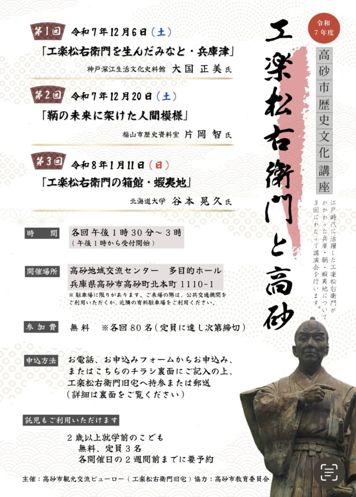 一般社団法人高砂市観光交流ビューローが、令和7年12月6日(土)・20日(土)、令和8年1月11日(日)の計3回「工楽松右衛門と高砂」という題名で歴史文化講座を開催します。