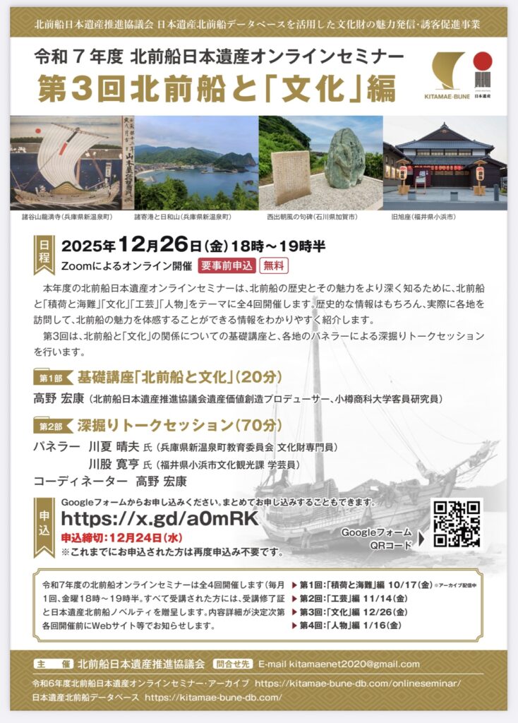令和7年度第3回北前船日本遺産オンラインセミナーの内容が決まりましたのでご案内させていただきます。