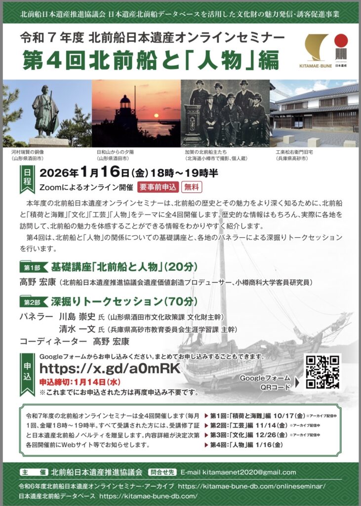 令和7年度第4回北前船日本遺産オンラインセミナーの内容が決まりましたのでご案内させていただきます。
